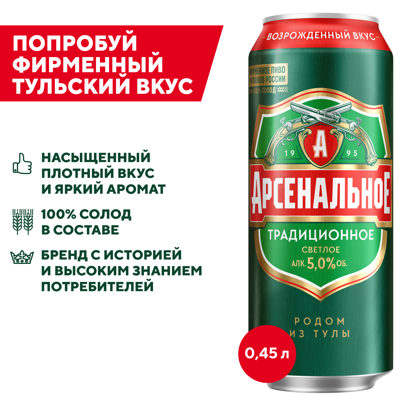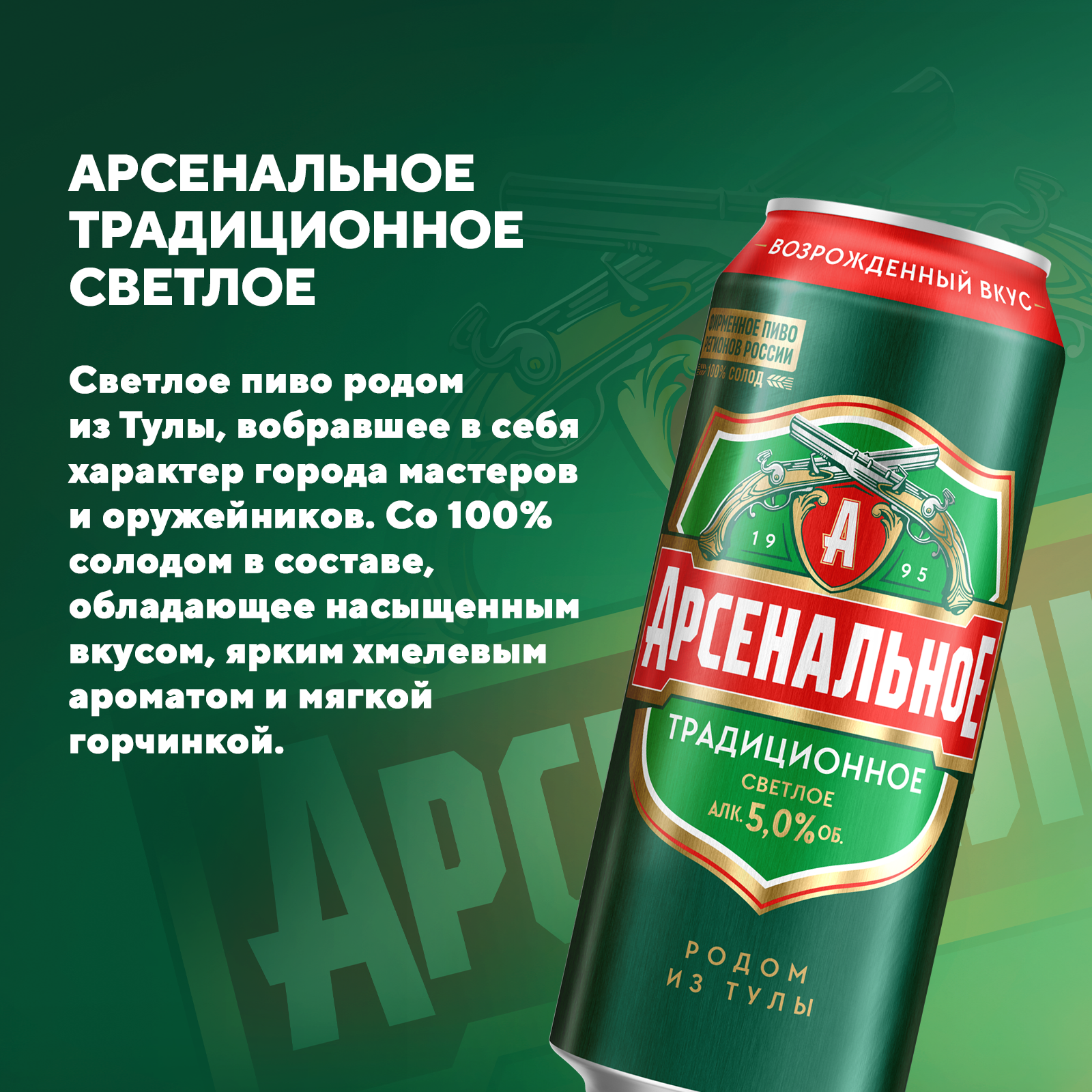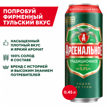 Пиво ""Арсенальное"" - родом из Тулы и воплощает в себе мужественность и опыт города мастеров и оружейников. ""Арсенальное Традиционное Светлое"" обладает умеренной горечью, насыщенным цветом и сбалансированным приятным вкусом.