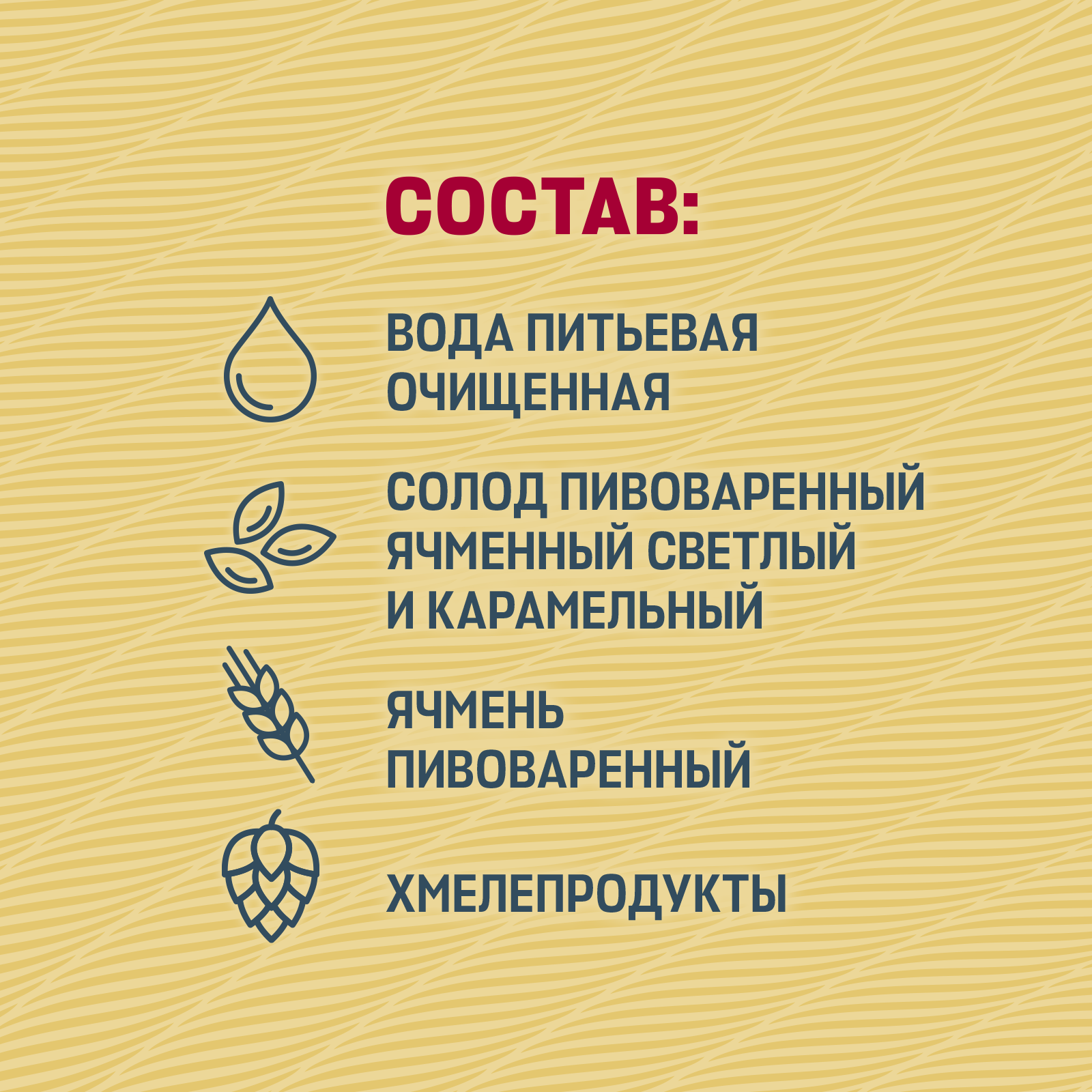 вода питьевая очищенная, солод пивоваренный ячменный светлый и карамельный, ячмень пивоваренный, хмелепродукты.