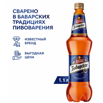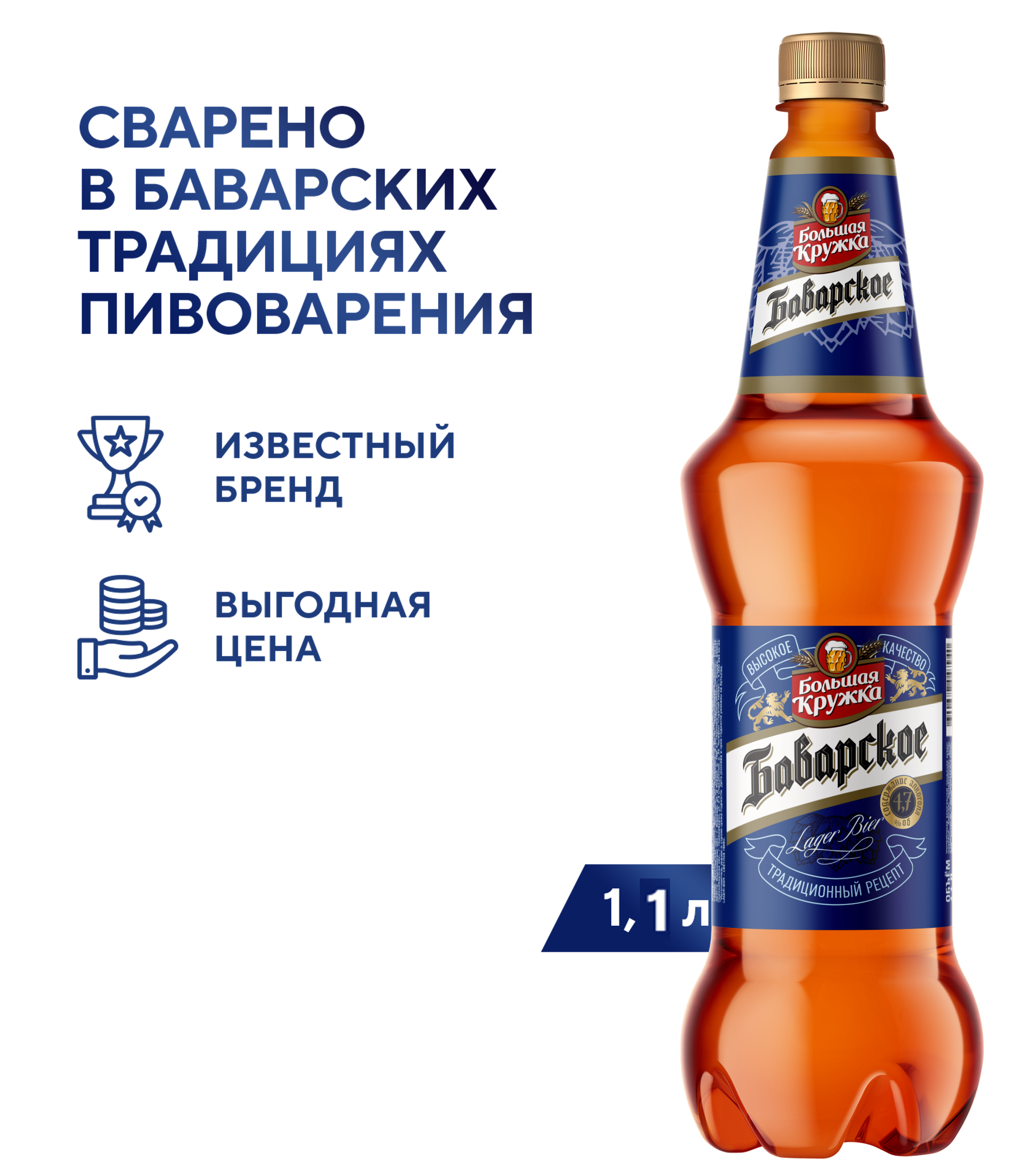 Большая Кружка Баварское - сорт пива, сваренный в баварских традициях пивоварения. Пиво золотистого цвета с выраженным хмелевым ароматом и умеренной горечью придется по вкусу всем ценителям пенного напитка