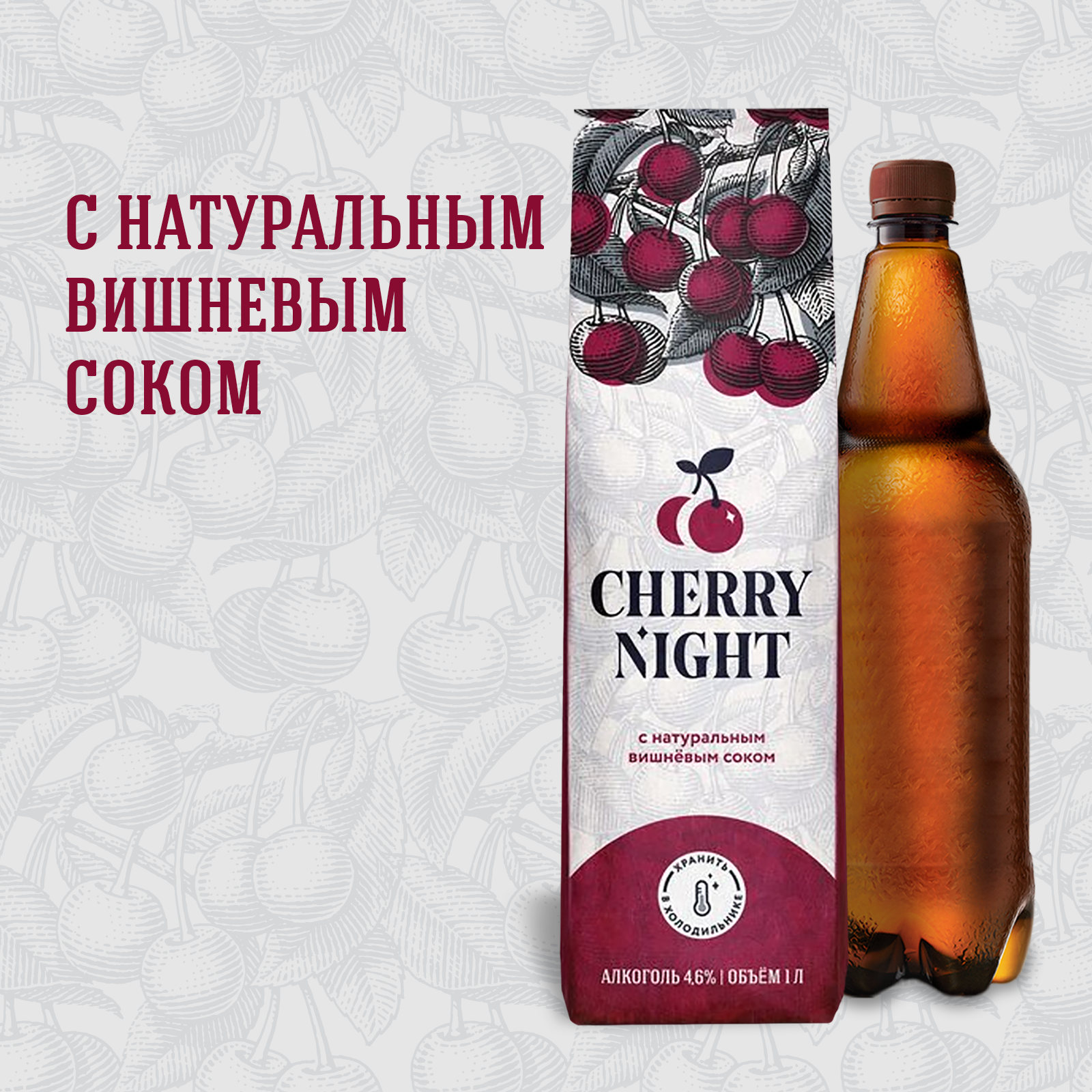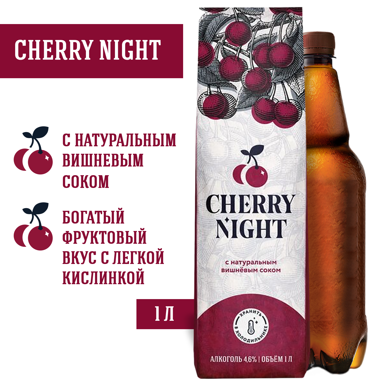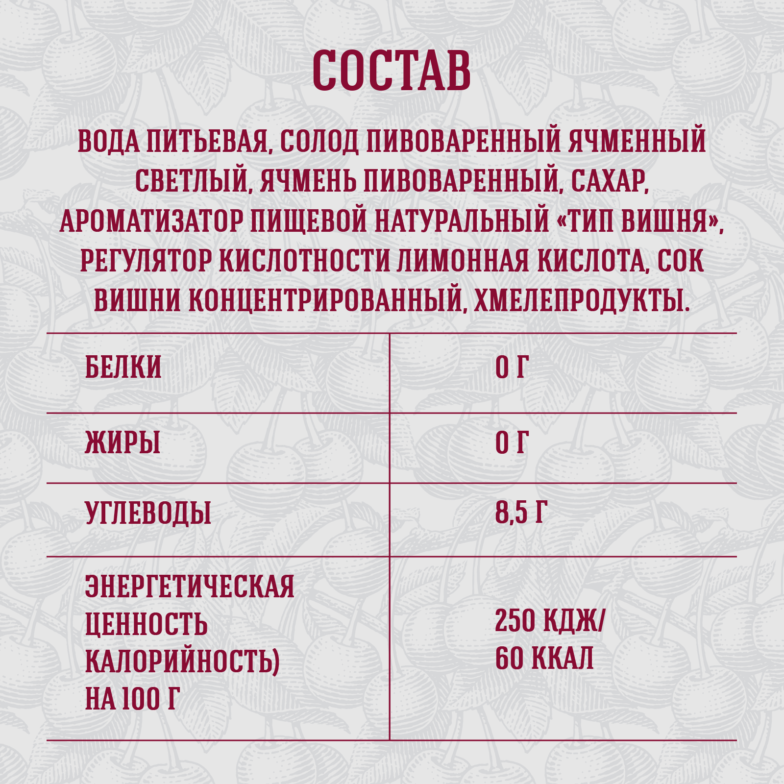 вода питьевая очищенная, солод пивоваренный ячменный светлый, сахар, ароматизатор пищевой натуральный «тип Вишня», регулятор кислотности лимонная кислота, сок вишни концентрированный, хмелепродукты.