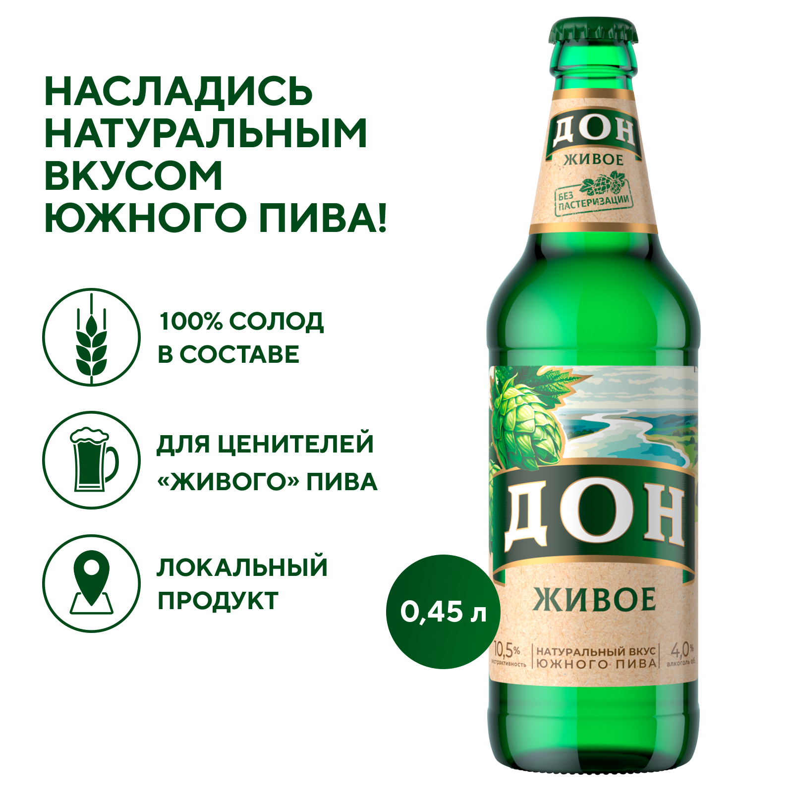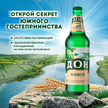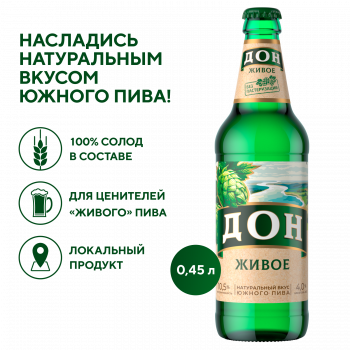 Дон Живое – светлый фильтрованный непастеризованный лагер сохраняет насыщенную полноту вкуса и обладает ароматом хмеля и свежего хлеба, напоминающего о бескрайних южных полях