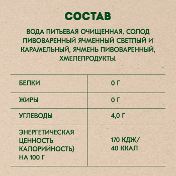 Вода питьевая очищенная, солод пивоваренный ячменный светлый и карамельный, ячмень пивоваренный, хмелепродукты