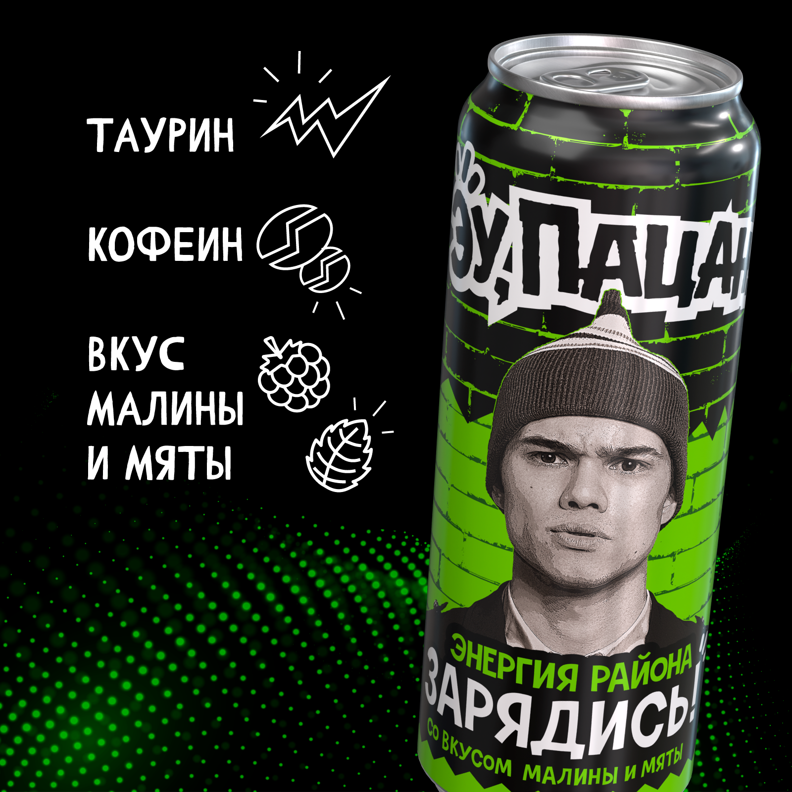 вода питьевая очищенная, сахар, регуляторы кислотности: кислота лимонная и цитрат натрия, таурин, ароматизатор пищевой «Малина», кофеин, ароматизатор пищевой натуральный «Тип Мята», краситель сахарный колер простой I, ароматизатор пищевой «Ягодная энергия», подсластители: цикламат натрия, ацесульфам калия, сахаринат натрия, краситель азорубин, консерванты: сорбат калия и бензоат натрия.