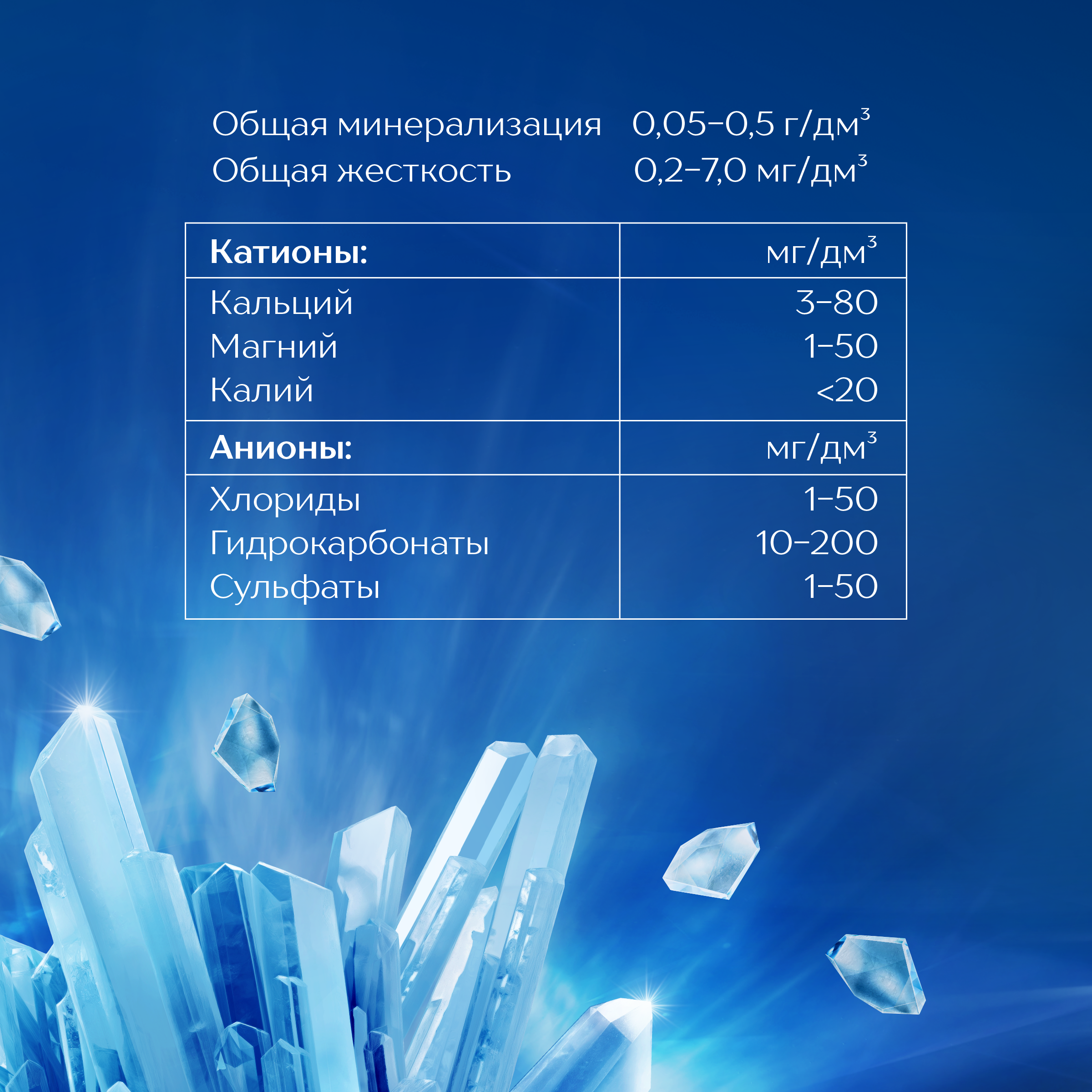 Общая жесткость 0,2-7,0 мг/л Катионы, мг/л: Кальций 3-80; Магний 1-50; Калий <20 Анионы, мг/л: Хлориды 1-50; Гидрокарбонаты 10-200; Сульфаты 1-50