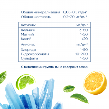 вода питьевая очищенная, регуляторы кислотности: лимонная кислота, цитрат натрия, ароматизатор пищевой натуральный «Лимон- лайм», комплексная пищевая добавка подсластитель «СВИТ» (цикламат натрия, сахарин, ацесульфам калия), консерванты: сорбат калия, бензоат натрия, витаминный премикс (витамин В3 (ниацин), витамин В5 (пантотеновая кислота), витамин В6 (пиридоксин), витамин В7 (биотин), витамин В9 (фолиевая кислота), витамин В12 (цианкобаламин)).