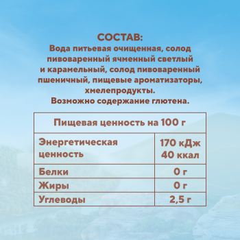 вода питьевая очищенная, солод пивоваренный ячменный светлый, ячмень пивоваренный, ароматизатор пищевой эмульсионный (ароматизатор ваниль, стабилизаторы: Е414, Е444, Е445, консерванты: Е202, Е211, антиокислитель Е330), солодовый экстракт, хмелепродукты.