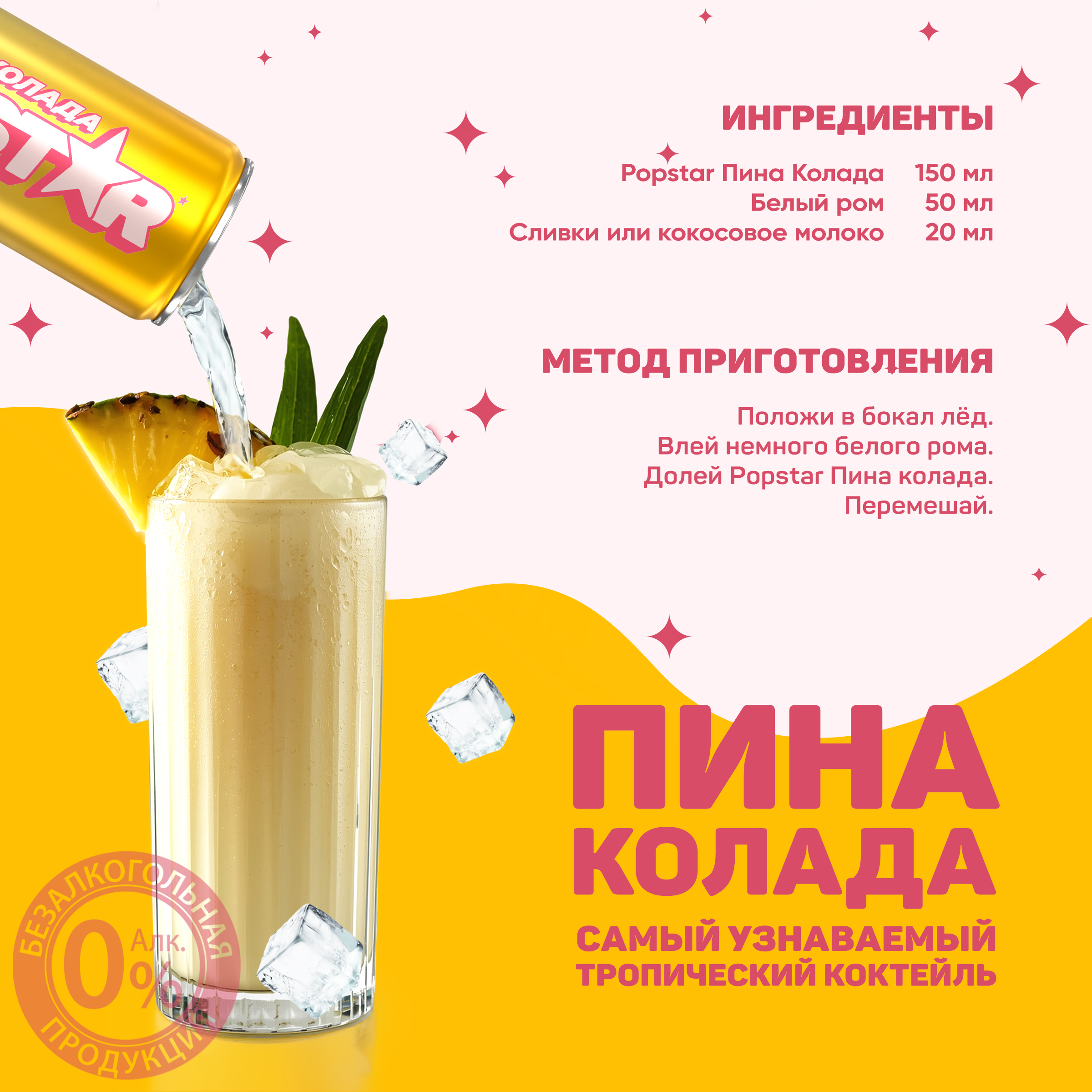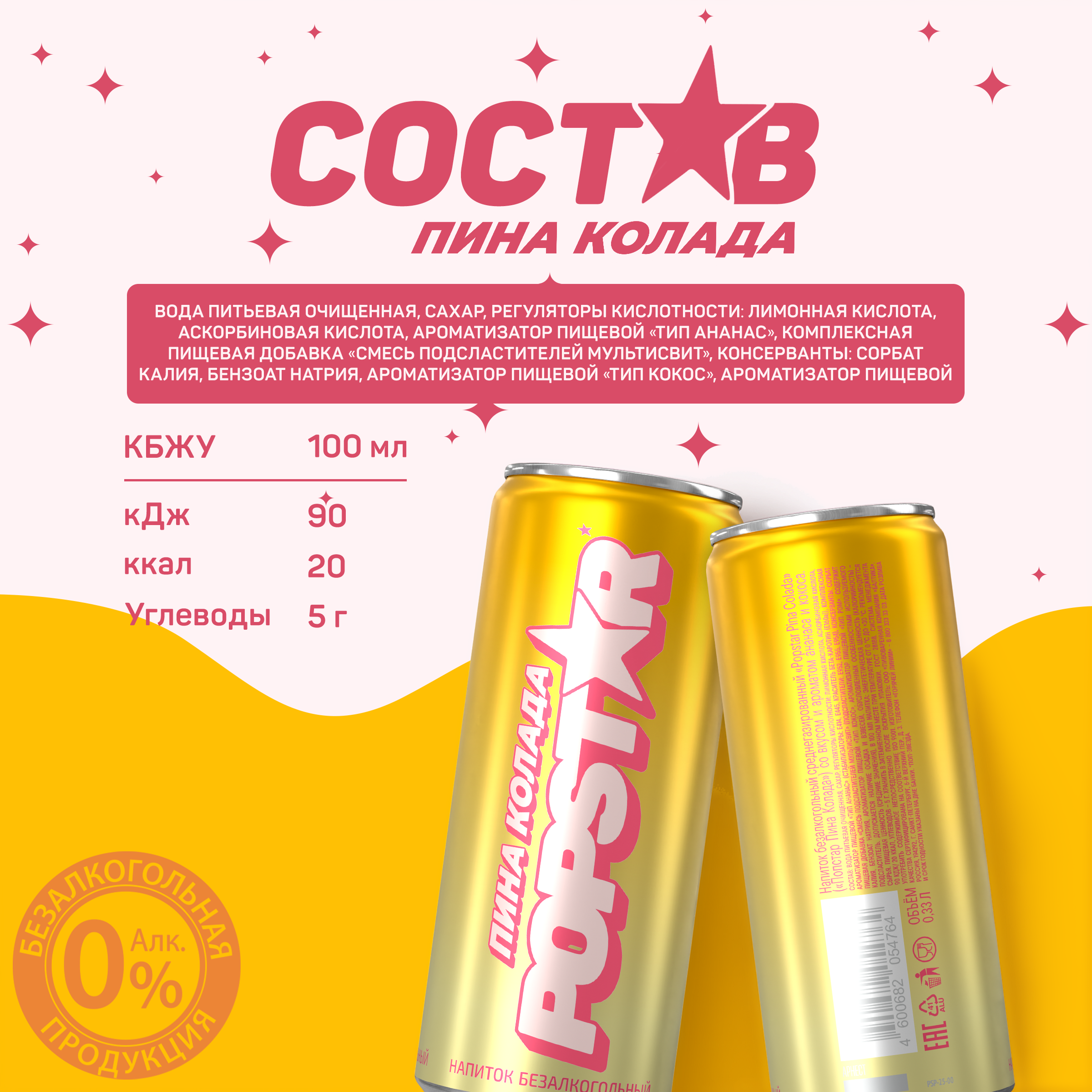 вода питьевая очищенная, сахар, регуляторы кислотности: лимонная кислота, аскорбиновая кислота, ароматизатор пищевой «Тип Ананас» (стабилизаторы: E414, Е445, краситель бета-каротин (Е160а)), комплексная пищевая добавка «Смесь подсластителей Мультисвит» (подсластители: Е952, Е955, Е954), консерванты: сорбат калия, бензоат натрия, ароматизатор пищевой «Тип Кокос», ароматизатор пищевой «Тип Ром».