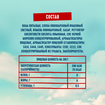 вода питьевая, солод пивоваренный ячменный светлый, сахар, регулятор кислотности лимонная кислота, сок черной моркови концентрированный, ароматизаторы пищевые, ароматизатор пищевой эмульсионный (стабилизаторы: E414, E444, E445, консерванты: Е202, Е211), сок концентрированный из граната, хмелепродукты.